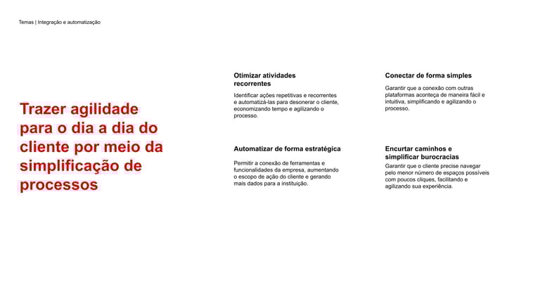 Benchmarking nacional e internacional: Sob minha coordenação, a equipe realizou um benchmarking aprofundado, analisando produtos financeiros e soluções digitais de referência para grandes contas PJ. O processo envolveu duas semanas de coleta, validação com o cliente e curadoria de tendências relevantes, incluindo exemplos de outros setores que já endereçavam dores similares.