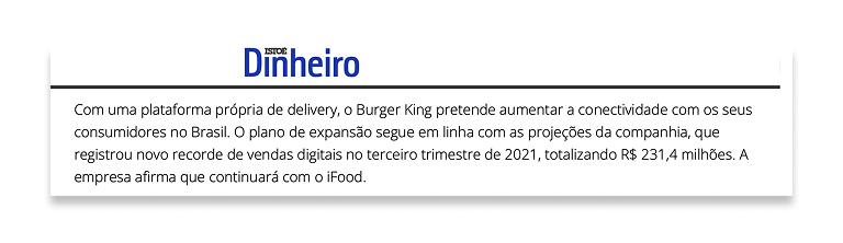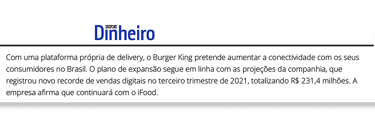 O delivery próprio foi relançado, já incorporando as principais alterações sugeridas a partir das pesquisas realizadas. Ao longo do ano, novas atualizações e integrações com outros produtos da marca foram implementadas, consolidando uma operação mais eficiente e inovadora. Esse processo contínuo de evolução garantiu ao Burger King uma experiência de delivery diferenciada e competitiva, com impacto direto nos lucros que registraram o recorde de R$231,4 milhões em vendas digitais em um trimestre.