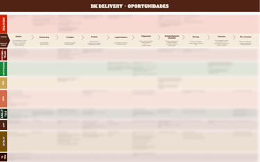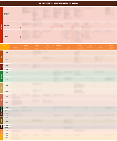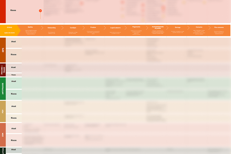Jornada Atual: Mostrando, na parte superior, como o setor de delivery atuava em cada etapa. Na parte inferior, o papel e os riscos de cada área da empresa.